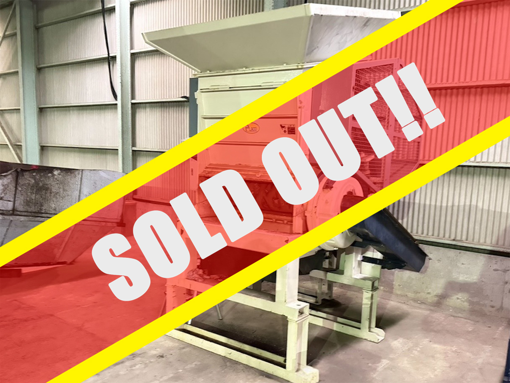 ・メーカー:プラコー ・商品名:一軸万能破砕機 ・型番:RZS-1000 G ・電源:三相 200 V ・周波数:50/60 Hz ・動力:30 kW(40HP) ・回転刃:32 枚 ・固定刃:4 枚(2×2) ・ローダー径:Φ240 mm ・ローダー幅:980 mm ・ローダー回転数:80 rpm ・投入口寸法=w1500×D1430 mm ・処理能力:1~2 T/日 ・年式:2009年12月