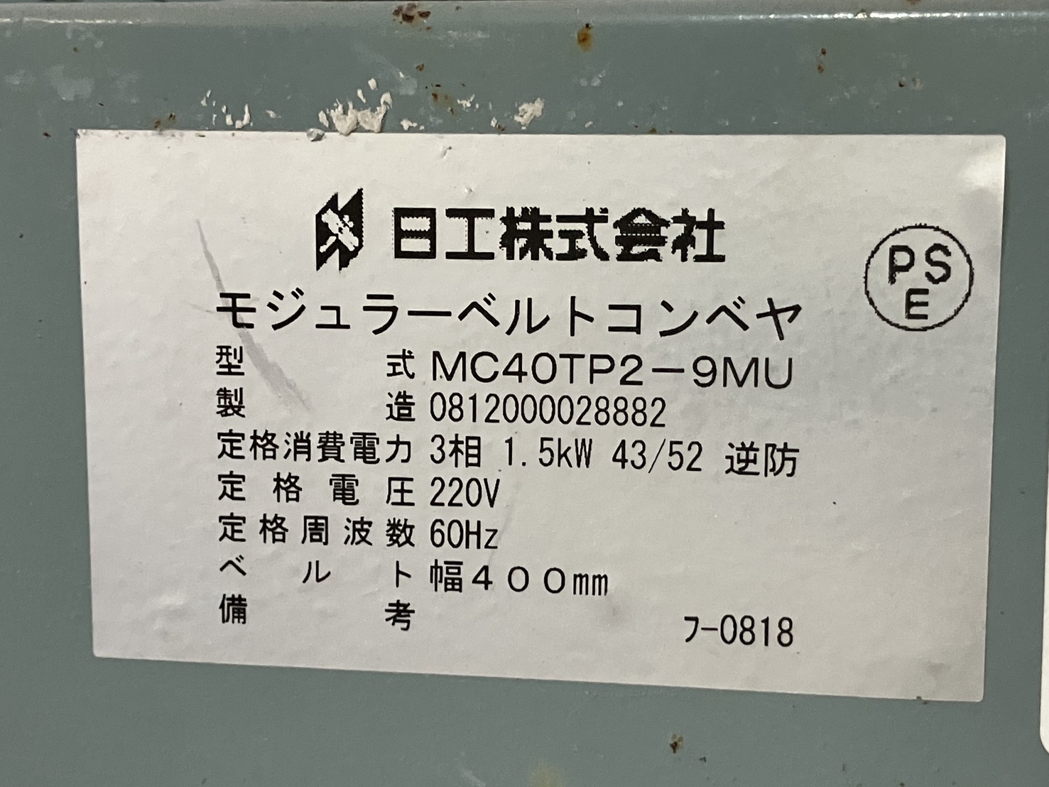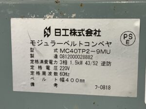 ■新古品■<日工>モジュラーベルトコンベヤ MC40TP2-9MU 三相1.5kW 60Hz ■ お問合せ番号 251014Y002 管理番号 251014Y002 価格 内容 ・メーカー:日工 ・設備名:モジュラーベルトコンベヤ ・型式:MC40TP2-9MU ・定格消費電力:三相 1.5 kW 43/52 逆防 ・定格電圧:220 V ・定格周波数:60 Hz ・ベルト幅:400 mm ・フレーム幅:520 mm ・機長:9000 mm ・外寸:W655×H400 mm ★価格交渉可能です!お気軽にお問合せください! 状態 ・新古品 ・現状渡し ・現地確認可 ・運搬については別途ご相談 掲載日 2025年10月14日 保管場所 静岡県