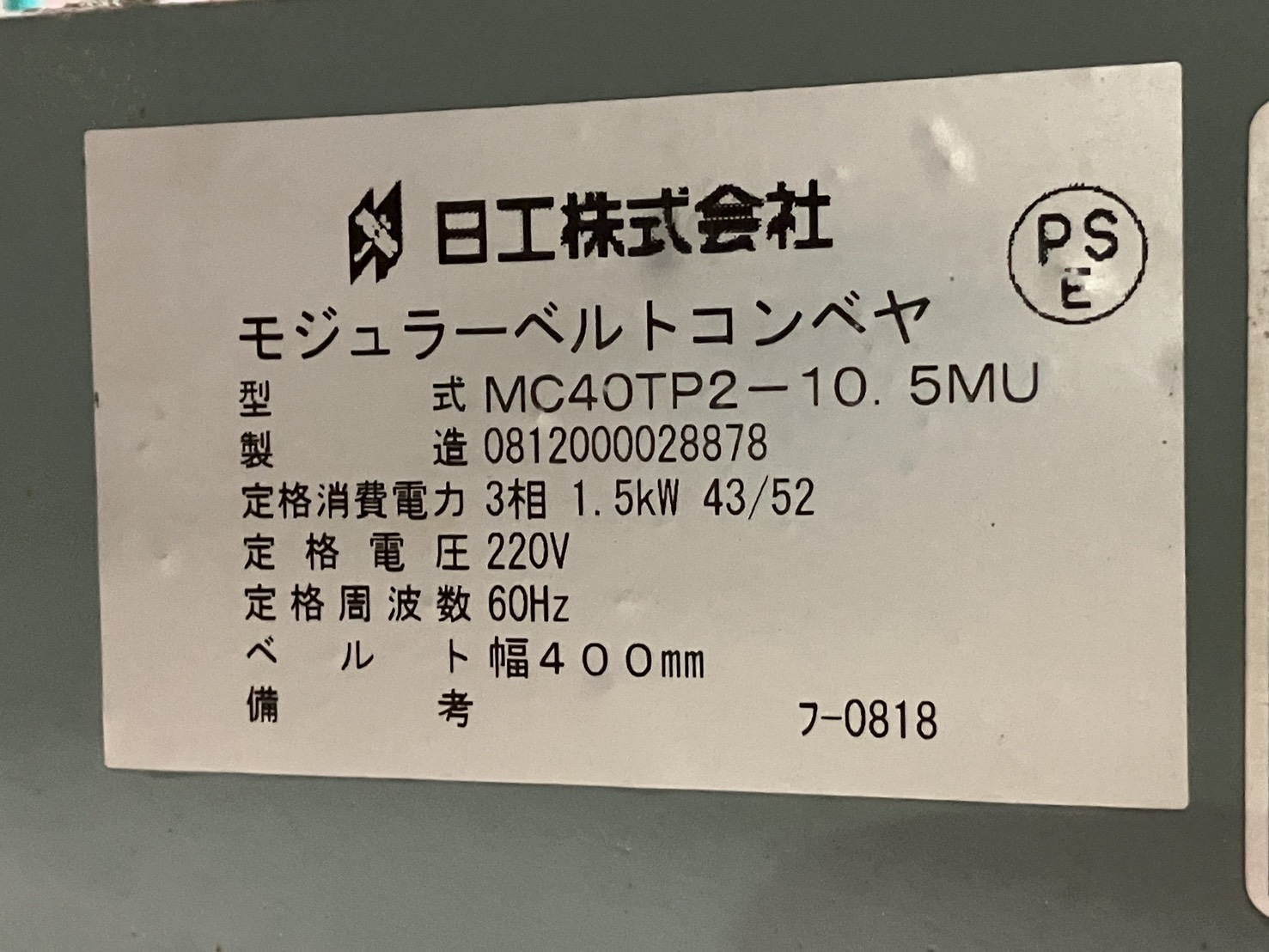 ■新古品■<日工>モジュラーベルトコンベヤ MC40TP2-10.5MU 三相1.5kW 60Hz ■ お問合せ番号 251014Y003 管理番号 251014Y003 価格 内容 ・メーカー:日工 ・設備名:モジュラーベルトコンベヤ ・型式:MC40TP2-10.5MU ・定格消費電力:三相 1.5 kW 43/52 ・定格電圧:220 V ・定格周波数:60 Hz ・ベルト幅:400 mm ・フレーム幅:520 mm ・機長:10500 mm ・外寸:W640×H410 mm ★価格交渉可能です!お気軽にお問合せください! 状態 ・新古品 ・現状渡し ・現地確認可 ・運搬については別途ご相談 掲載日 2025年10月14日 保管場所 静岡県